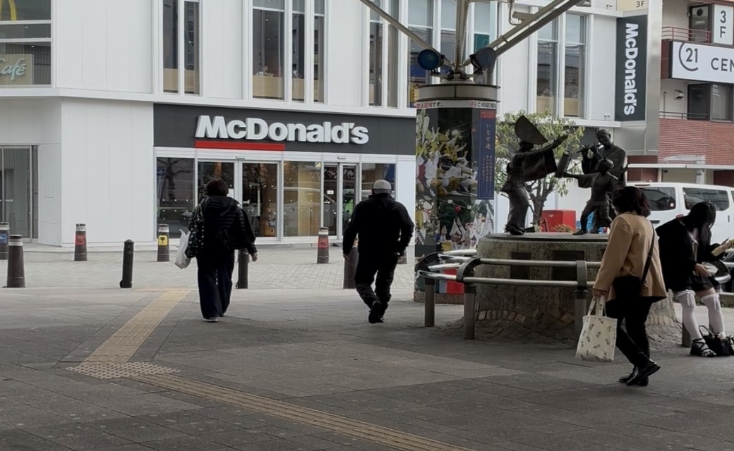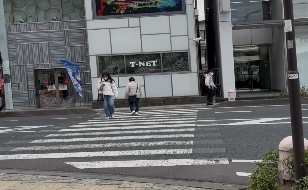 バスロータリーに沿って直進し、横断歩道を渡ります。