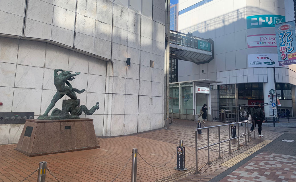 「町田東急ツインズEAST」の建物脇にあるスロープを通り、さらに直進します。左側に下に降りる階段が見えてきましたら、右に曲がったところにあるオブジェが集合場所の目印です。